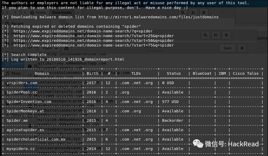 Joe Vest(@joevest) 和 Andrew Chiles(@andrewchiles)提供了另一个工具DomainHunter,它会返回一个表格,主要内容包括 BlueCoat、IBM X-Force和Cisco Talos中查询出的分类,域名年龄、可用的TLDs、Archive.org链接和HTML报告等信息。此外,它使用malwaredomains.com和mxtoolbox.com来检查域名是否存在已知的恶意软件和网络钓鱼活动,该工具还包括了绕过BlueCoat/WebPulse验证码的OCR功能(查看该工具更多详细信息)。