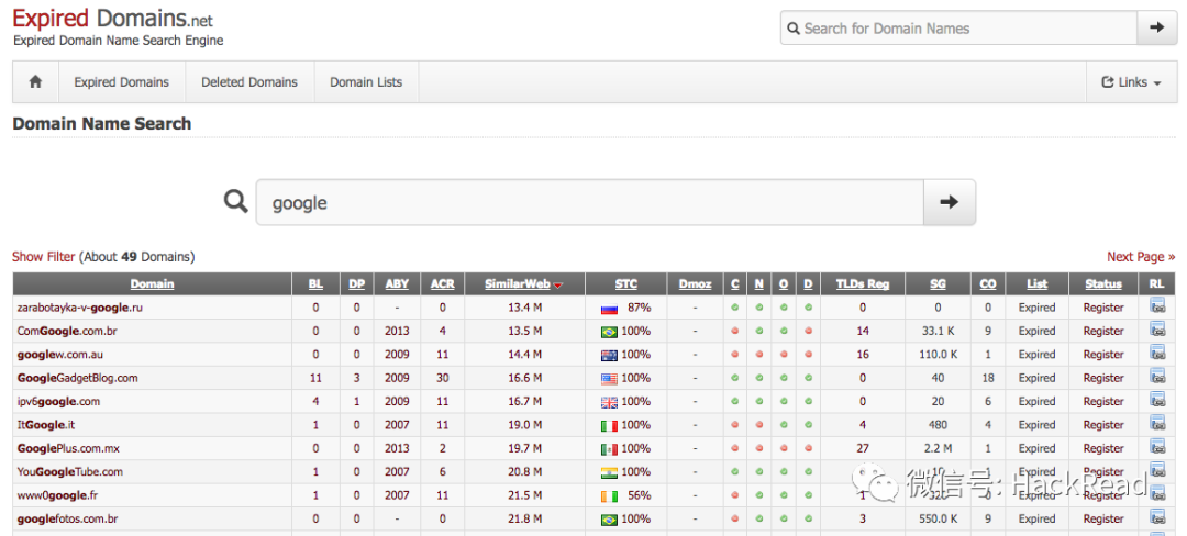 expireddomains.net 是一个收集最近过期或已丢弃域名的引擎。它提供了搜索和高级过滤,例如:到期时间、反向链接数量、archive.org快照数量、SimilarWeb(https://www.similarweb.com/)分数。使用 SimilarWeb 网站,我们可以注册预先使用的域,这些域将与目标域名的年份相同,会使它看起来与我们的目标域类似,使他融入我们的目标网络来迷惑对手。