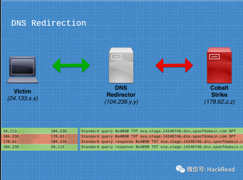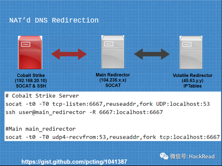 为了进一步提高系统弹性和隐蔽性,每个后端资产(即团队服务器)都应该在其前面放置一个转向器(redirector)。这样的目的是保证目标和我们的后端服务器之间间接的建立连接。这种方式有两种好处:1.是能够解耦各个功能资产服务;2.是能够达到隐蔽效果。当某一个资产服务被蓝队发现时,无需部署整套后端服务,便可进行迁移会话、重连接后端的未焚毁的资产等。