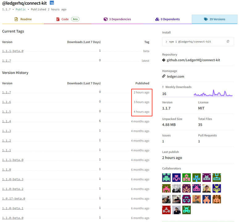 2)攻击者发布了 Ledger Connect Kit 的恶意版本(1.1.5、1.1.6 和 1.1.7);