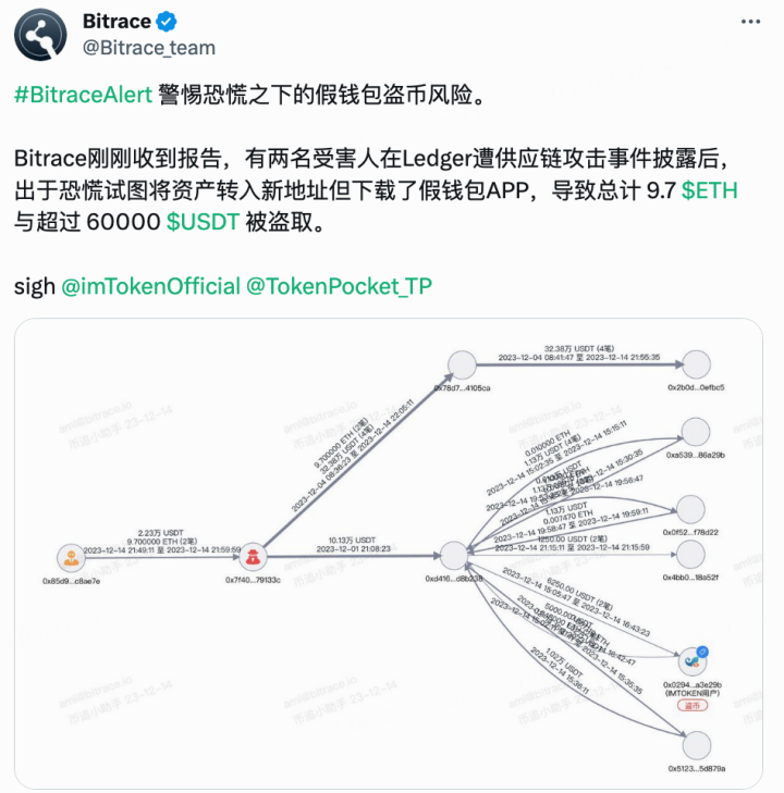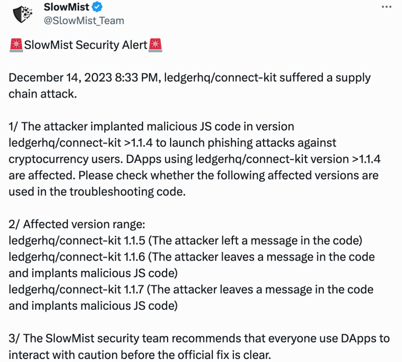 据慢雾安全团队情报,北京时间 2023 年 12 月 14 日晚,Ledger Connect Kit 遭受供应链攻击,攻击者至少获利 60 万美元。