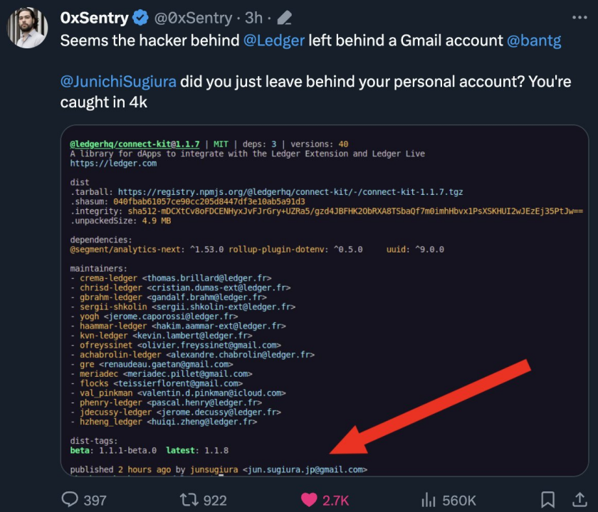 根据 @0xSentry 的推文,攻击者留下的数字痕迹中涉及 @JunichiSugiura(Jun,Ledger前员工)的 Gmail 账户,该帐户可能已被泄露,并且 Ledger 忘记删除该员工的访问权限了。