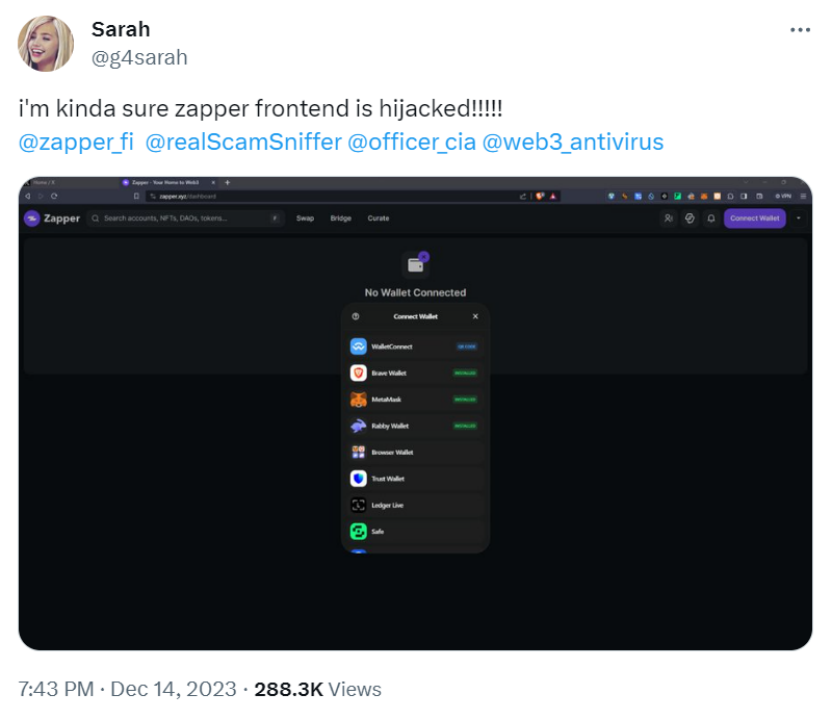 7:43 PM,推特用户 @g4sarah 表示 DeFi 资管协议 Zapper 的前端疑似被劫持。