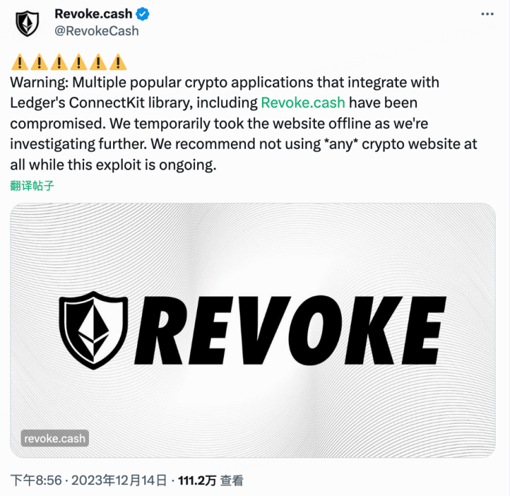 8:56 PM,Revoke.cash 于推特发文表示:“与 Ledger Connect Kit 库集成的多个常用加密应用程序(包括 Revoke.cash)已受到损害。我们暂时关闭了该网站。我们建议在该漏洞利用期间不要使用任何加密网站。” 随后,跨链 DEX 项目Kyber Network 也表示,出于谨慎考虑,其已禁用前端 UI,直到情况明确为止。