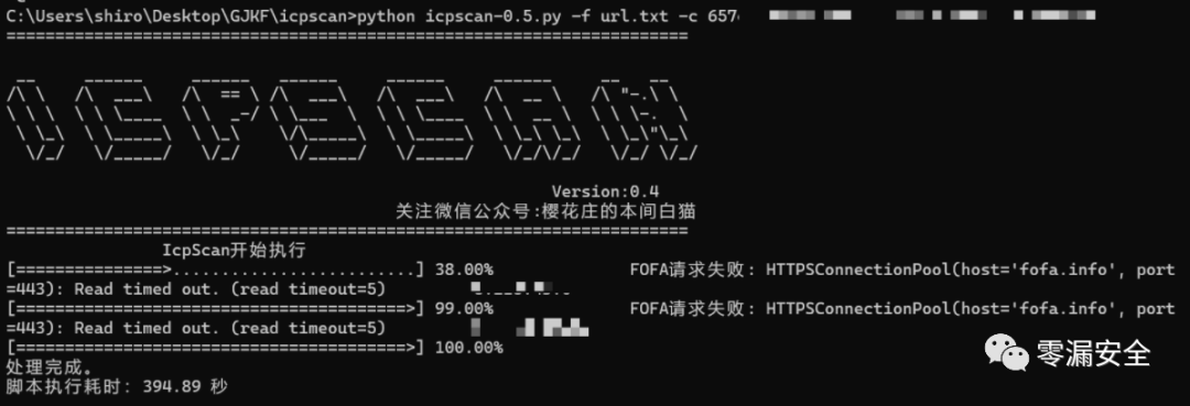 ICPSCan 开发本工具的主旨是批量对ip、域名资产查询备案信息,为大规模扫描提供帮助。当前已支持循环测试域名,例如 api.qq.baidu.com,可依次查询 api.qq.baidu.com、qq.baidu.com、baidu.com 的备案信息,为避免遗漏备案! 该工具无需配置账号,到手即用,白嫖查询!如果对本工具有建议或BUG反馈,请关注微信公众号:使用帮助 python icpscan.py -h 查看帮助pip install -r requirements.txt安装必须的环境执行 python icpscan.py -f 指定txt文件 -c 指定cookie