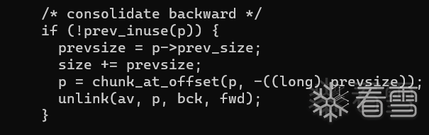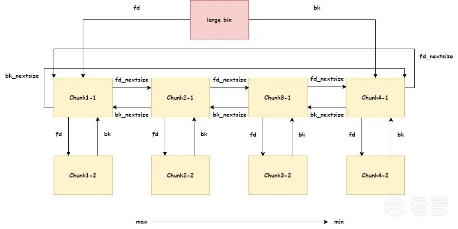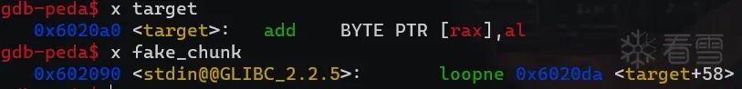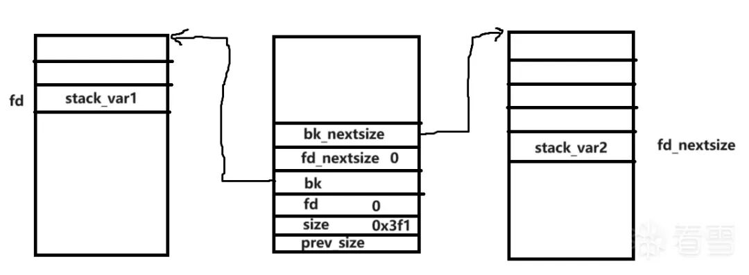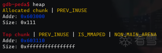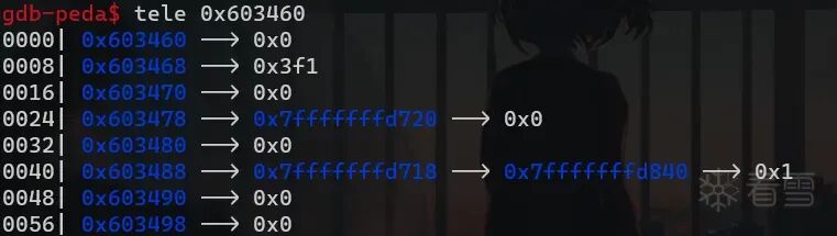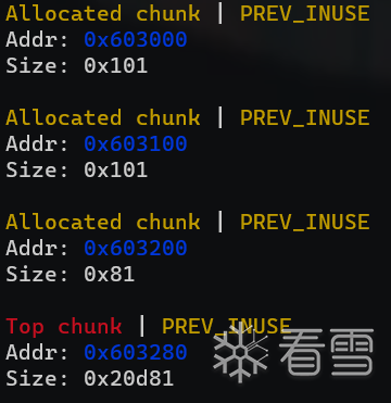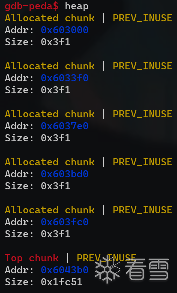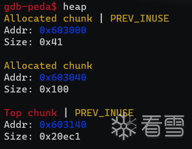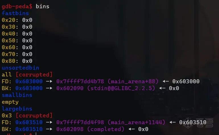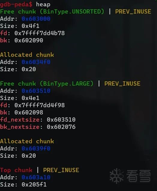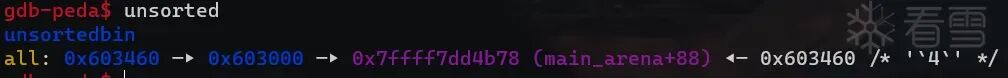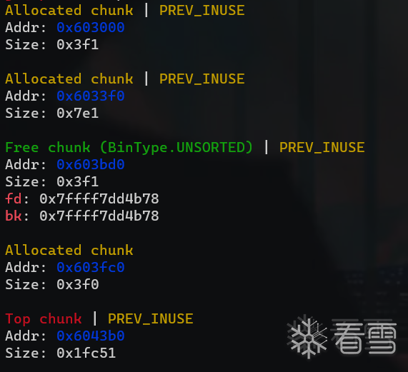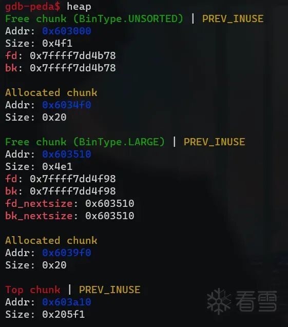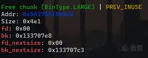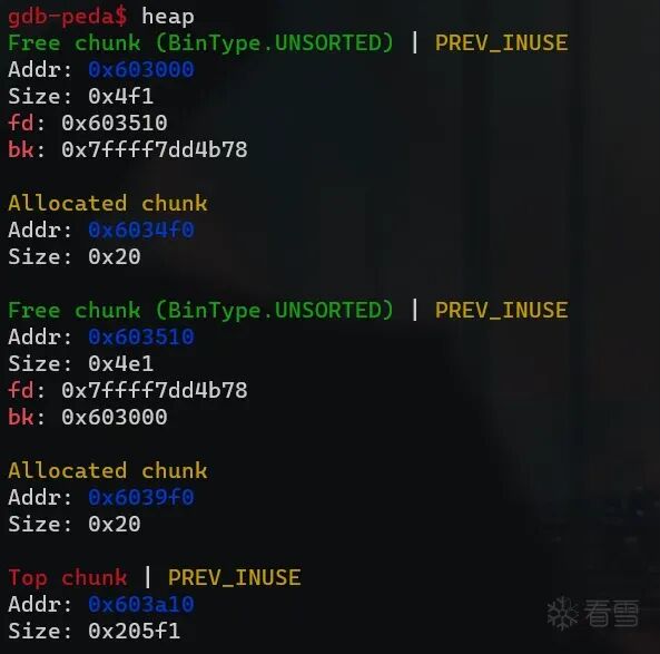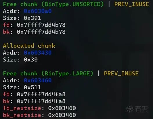 同样在打印前下一个断点,可以看到其bk位置为一个堆地址。