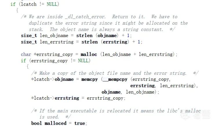 可以在源码中发现,由于free一个错误堆块调用了malloc_printerr函数,最后在dl-error.c调用了malloc函数。