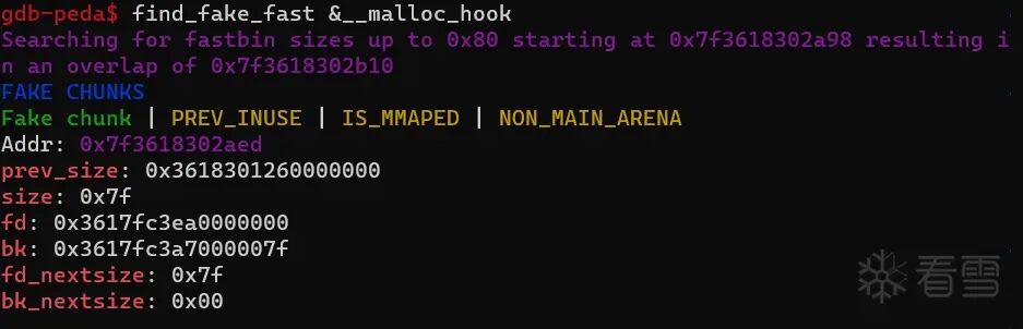 通过find_fake_fast来寻找__malloc_hook附近的fake_chunk。fake_chunk的prev_size距离__malloc_hook有0x23大小。所以填充0x13字节即可覆盖到目标地址。