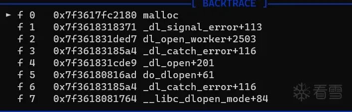 我们可以通过k来查看函数调用栈,发现free报错后会在动态链接器调用malloc。