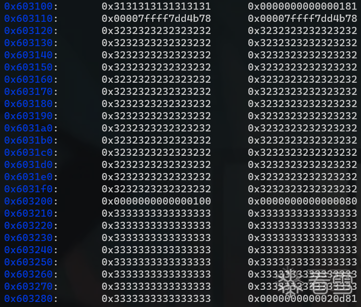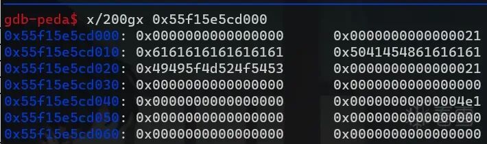 堆地址也可以通过unsorted bin的bk指针泄露,我们将两个不连续的non-fast大小的堆块放入unsorted bin中,由于unsorted bin采取先进先出模式,所以我们会将结构体1重新申请出来,它ErrMsg的bk位置便是结构体3的地址。然后通过改名函数将ErrMsg的前八个字节覆盖满,然后便可通过打印函数将堆地址泄露。