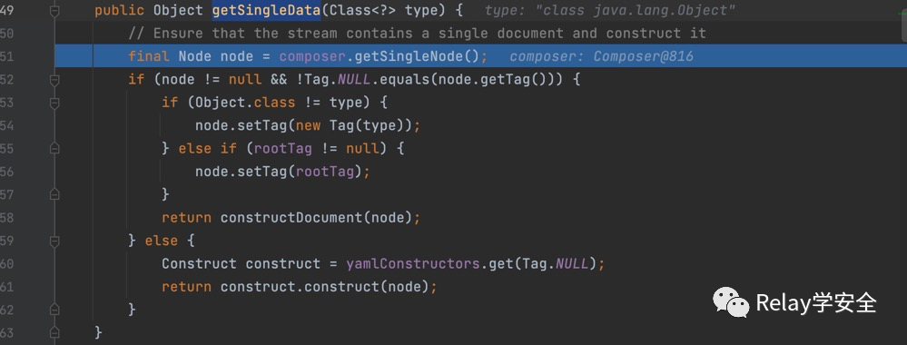 回到我们刚才的loadFromReader方法,创建了一个Composer对象,将我们刚才赋值好的ScannerImpl传进去,之后将其封装到constructor()中。我们继续跟进getSingleData方法。