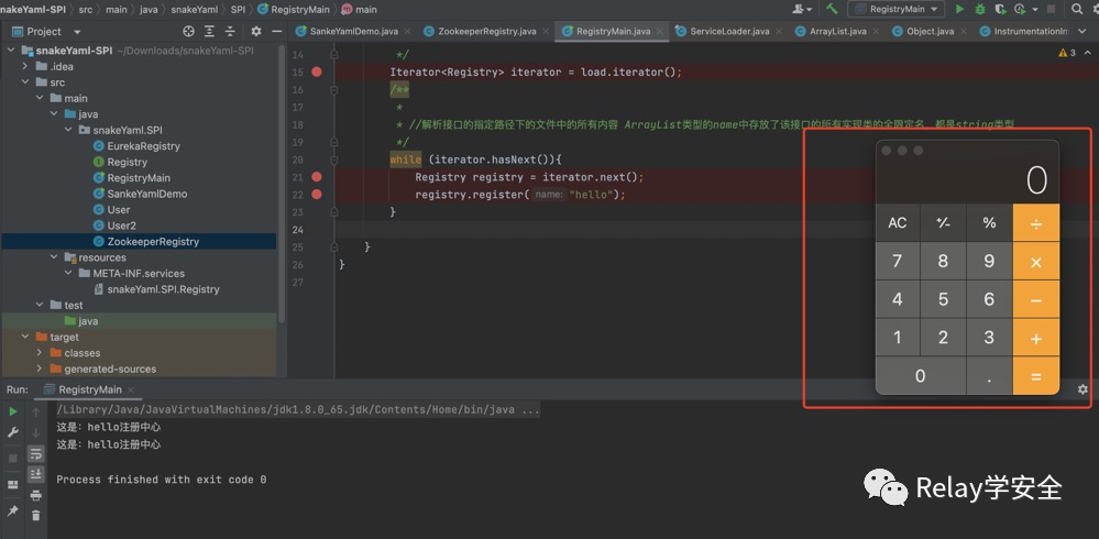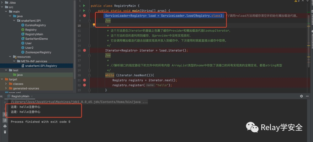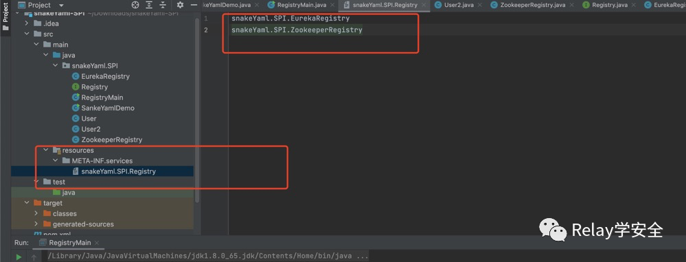 package snakeYaml.SPI;import java.util.Iterator;import java.util.ServiceLoader;public class RegistryMain {public static void main(String[] args) {ServiceLoader<Registry> load = ServiceLoader.load(Registry.class);Iterator<Registry> iterator = load.iterator(); while (iterator.hasNext()){Registry registry = iterator.next();registry.register("hello");}}}