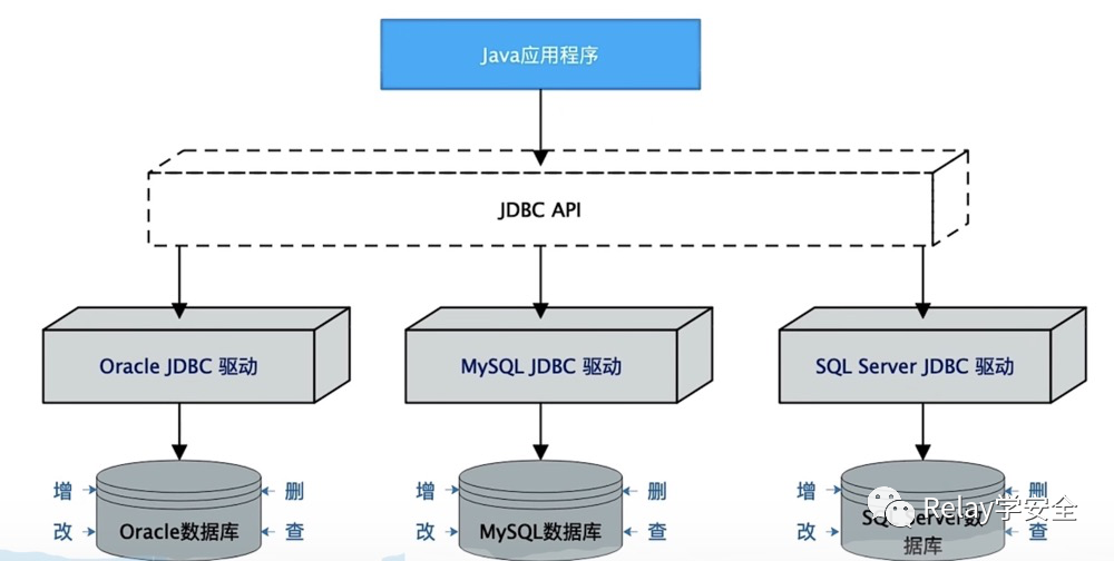 下面这张图是JDBC的架构。最上层是Java应用程序,会调用JDBC的API,然后在映射到对应的数据库驱动,