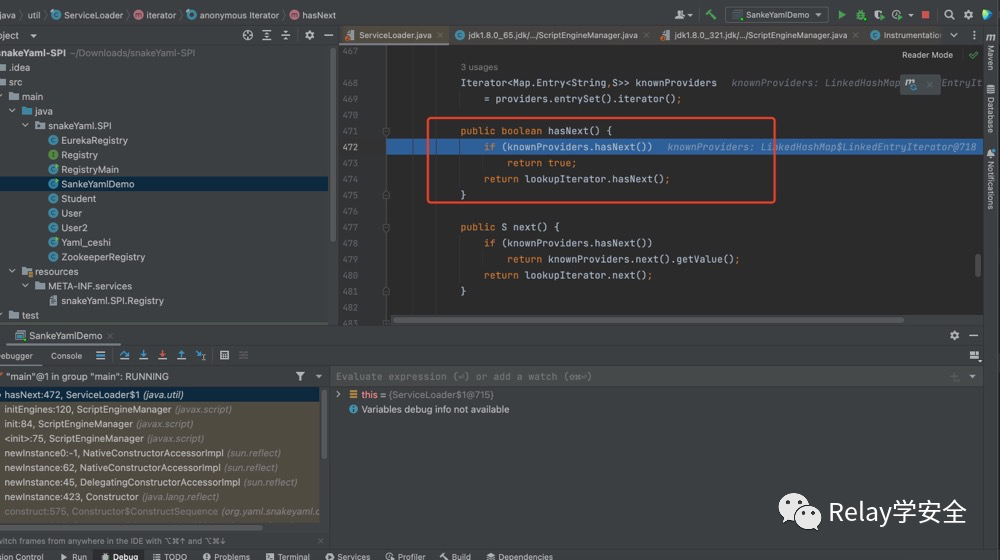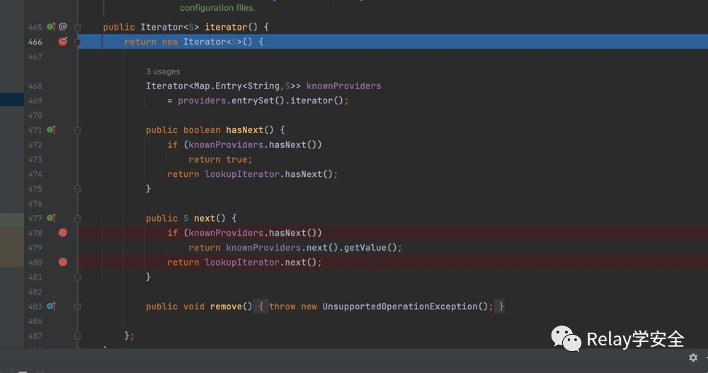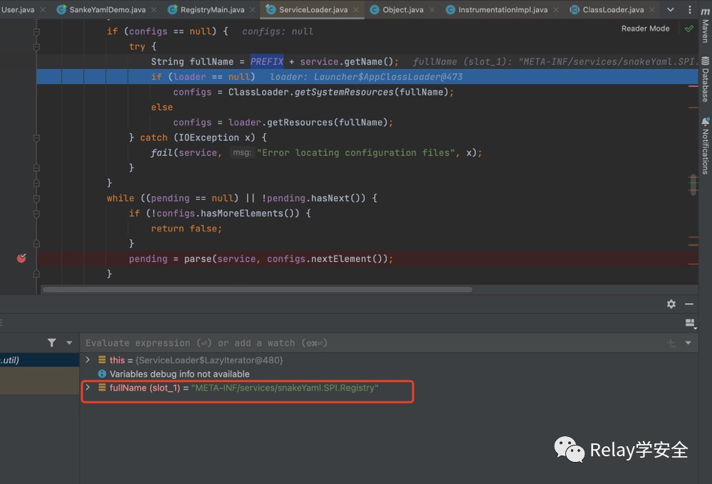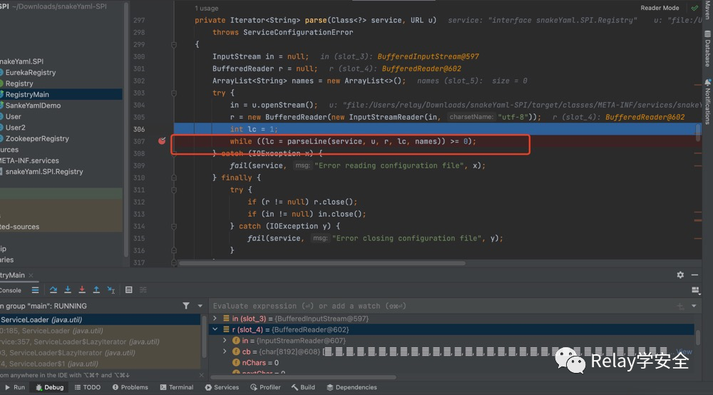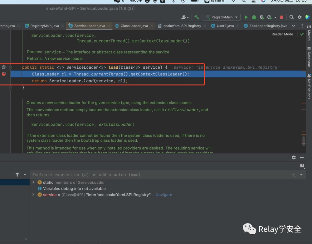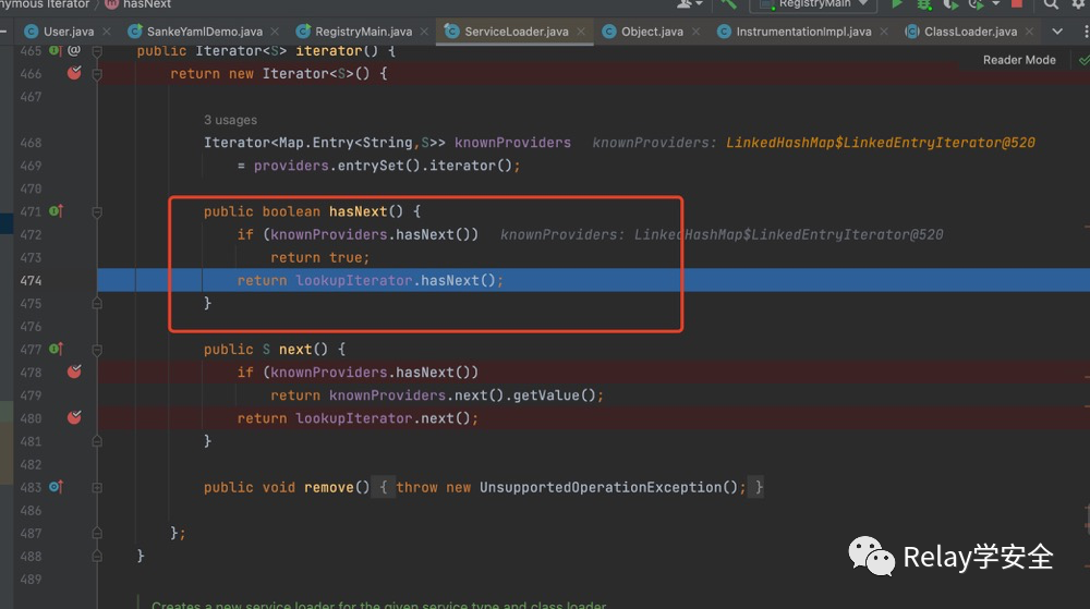 首先在 ServiceLoader.load(Registry.class);这一行下断点。