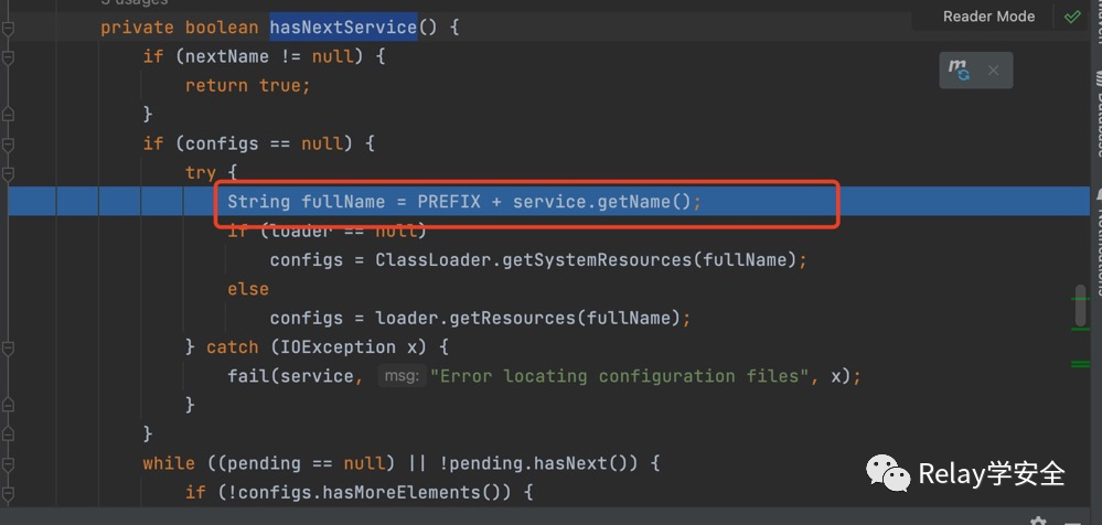 在hasNextService方法中,通过service的getName方法和PREFIX拼接拿到我们META下的文件名称。