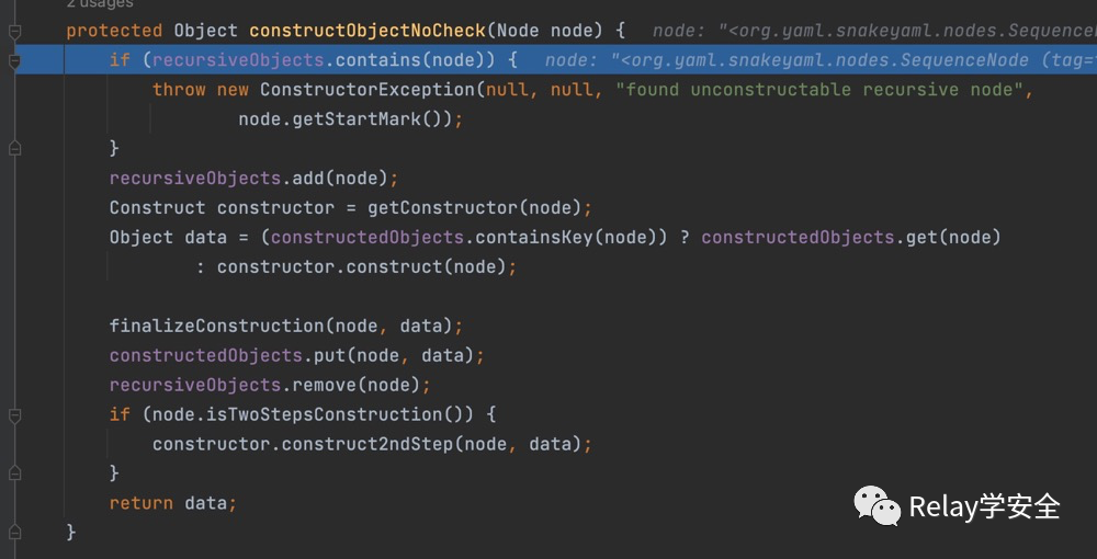 来到constructDocument方法,再次跟进constructObject方法,继续跟进constructObjectNoCheck方法,这里的recursiveObjects是空的,将我们的node添加到recursiveObjects中,这里进行三目运算,判断constructedObjects中是否包含指定的键名,我们的constructedObjects时空的所以执行construct方法,我们跟进去。