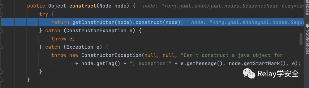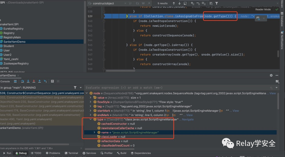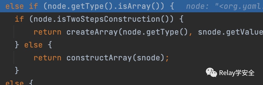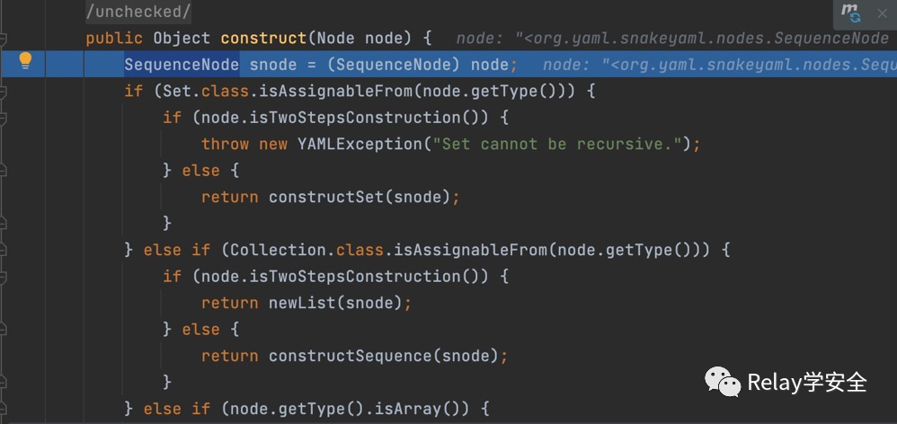 来到construct方法,首先将我们的node(包含恶意代码)强制转换为SequenceNode,然后调用isAssignableFrom来判断子类和父类的关系,这里的node.getType取出来其实是ScriptEngineManager,他并不是Set的子类或者父类所以继续判断往下走。