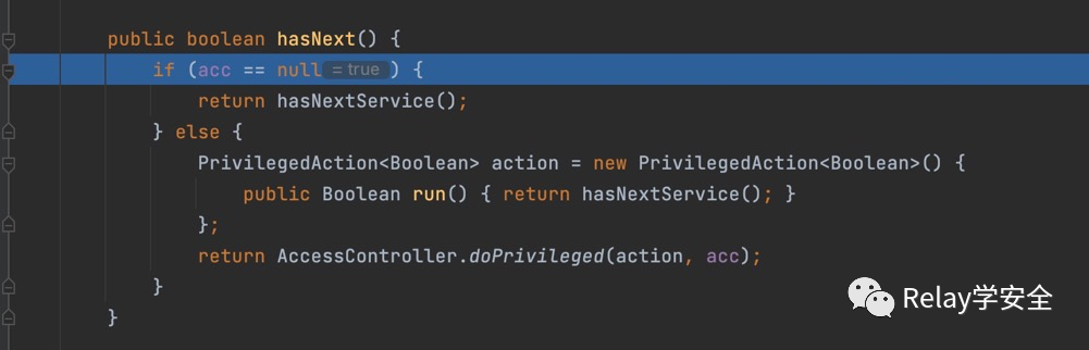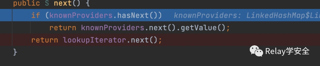 我们往下走跟进hasNext方法,有没有感觉这一幕很熟悉,没错这就是我们分析SPI的时候遇到过的,首先判断缓存中是否有值,否则调用lookupIterator的hashnext方法,我们跟进去。然后跟进去hasNextService方法。