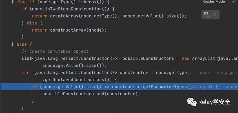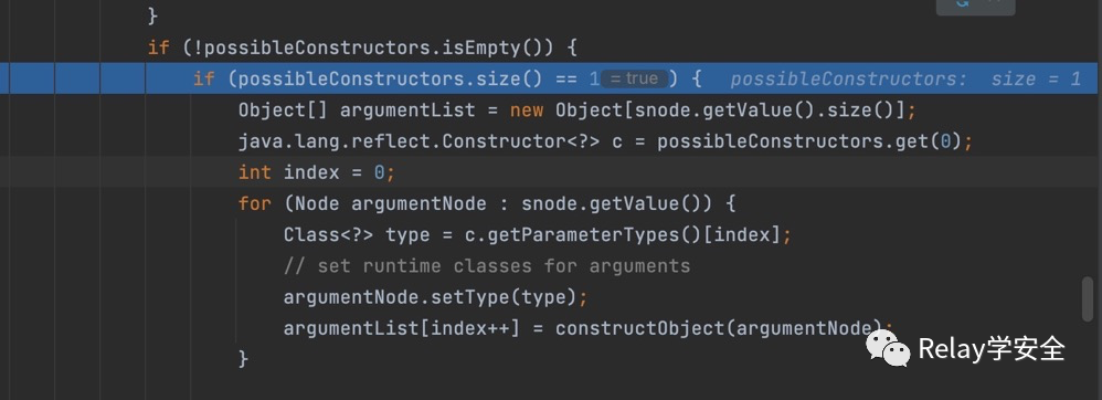 然后接着创建了一个possibleConstructors数组,然后去循环遍历node.getType()的构造器,然后进行判断snode的value值的size长度是否等于我们从node拿出来的构造器参数的长度是否一致,如果是一致的话,那么add到数组中,也就是说这个数组存储着我们的构造器。