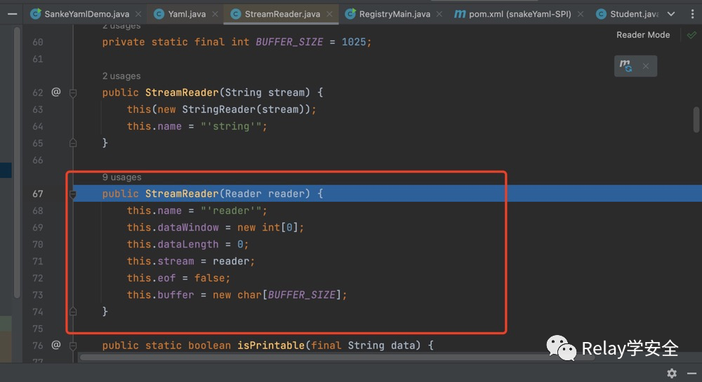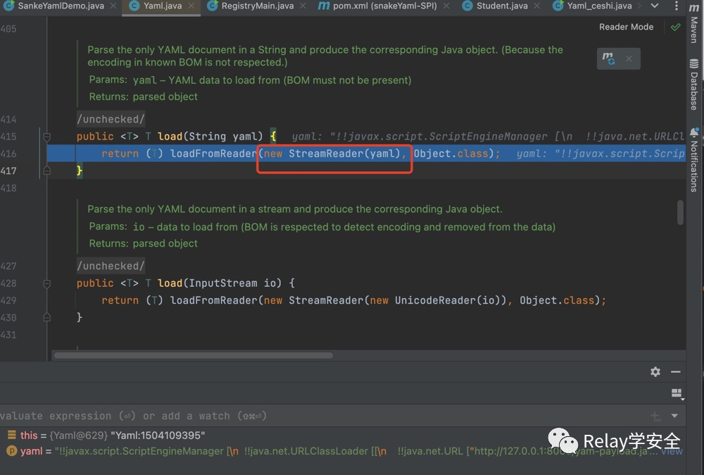 来到StreamReader的构造方法,首先调用StringReader对我们的payload再一次封装,然后调用他重载的构造方法,将我们的payload赋值给了StreamReader的stream属性。我们返回刚才的load方法,跟进loadFromReader方法。