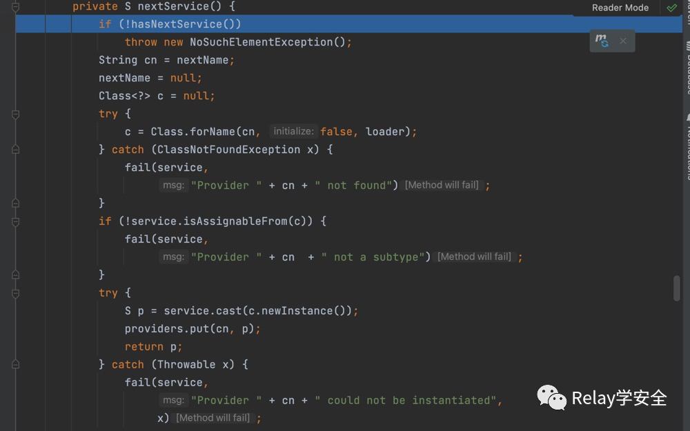 来到nextservice方法,这个nextName中存储着我们的全限定类名,这个是在我们上一步的时候赋值的,是这段代码: