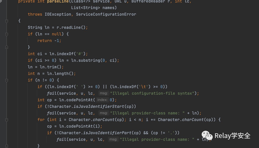 这个方法的执行流程是:1.通过BufferedReader的readLine读取一行2.处理#号和空格并拿到这一行的有效字节数3.for循环遍历实现类的全限定名,检查每个字符是否符合Java命名要求4.校验通过后检查缓存和names列表中是否有该值,无则添加5.返回要处理的下一行的行数最后将解析好的全限定类名放到names中(names是一个ArrayList集合)