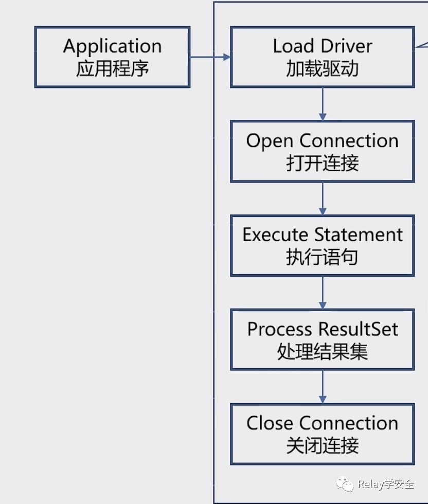 首先加载驱动->打开链接->执行SQL语句->处理结果集->关闭链接