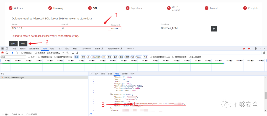 3.随便输入配置,点击“Next”,响应包中返回了系统数据库配置,大部分连接数据库就可以xp_cmdshell了。