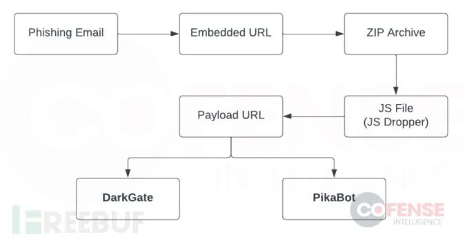 该攻击行动以被劫持的电子邮件开始,诱使受害者点击 URL。该 URL 地址也增加了访问限制,只有满足攻击者设定要求(位置与特定浏览器)的用户,才能正常获取到恶意 Payload。通过 URL 下载一个 ZIP 压缩文件,其中包含一个作为 Dropper 的 JavaScript 文件。通过它,可以访问另一个 URL 下载并运行恶意软件。到此阶段,受害者已经被 DarkGate 或 PikaBot 感染。