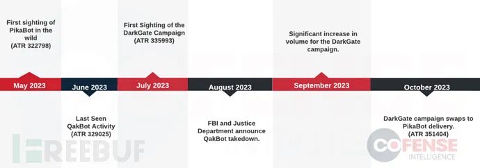 今年 9 月开始传播的 DarkGate 恶意软件已经发展成为世界上最先进的网络钓鱼攻击行动之一。从那时起,DarkGate 就不断完善检测规避策略与各种反分析技术。DarkGate 与 PikaBot 在 QakBot 销声匿迹一个月后激增,并且与 QakBot 的 TTP 相似。攻击者向各行各业传播了大量电子邮件,由于投递了恶意软件加载程序,受害者可能面临更复杂的威胁,如勒索软件等。