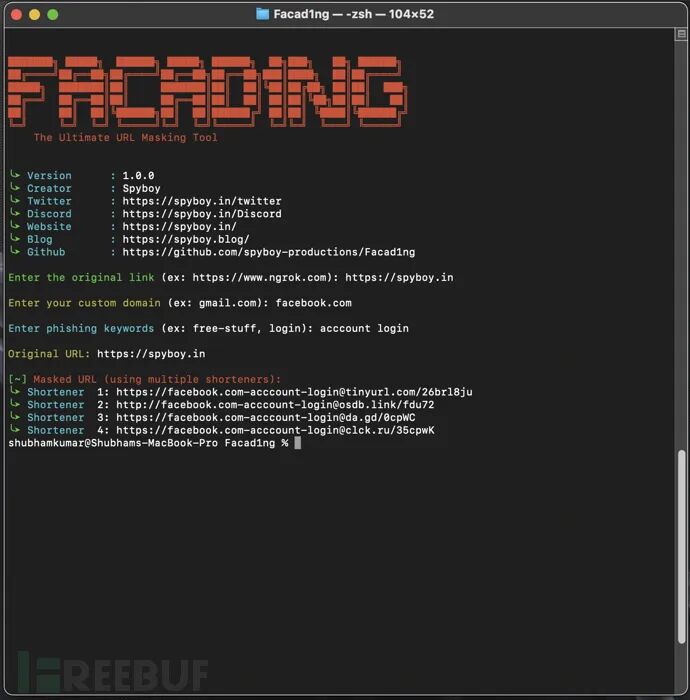 Facad1ng <your-phishing-link> <any-custom-domain> <any-phishing-keyword>使用样例: