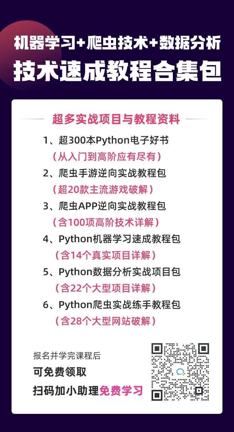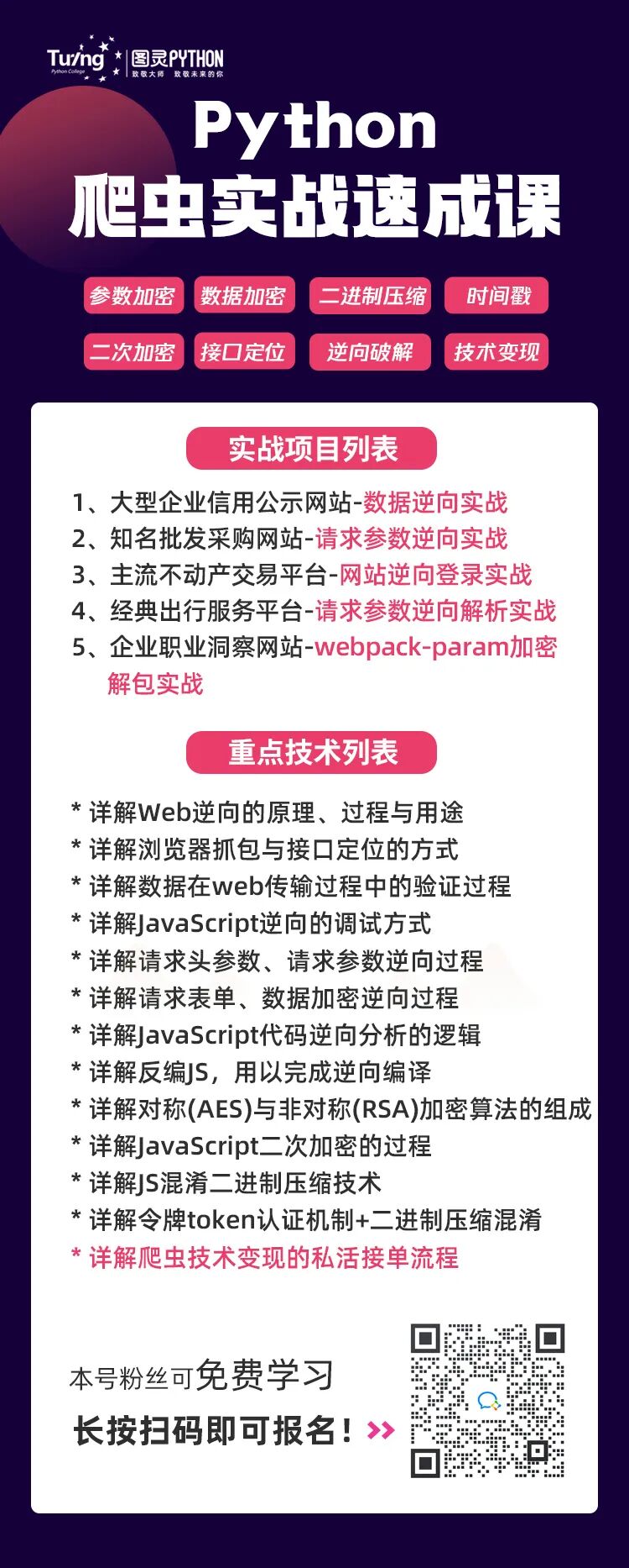 官方特训费299元,本号粉丝有福利,立即报名可免费学习!这是一套专讲爬虫逆向攻防的高阶技术实战课,迄今为止已帮助近三万学员快速进阶。本次课程将由国际大数据竞赛获奖大佬亲身指导,带领大家进行一线大厂高阶技术体系+APP\小程序\Web逆向攻防实战+技术变现路径指导的综合速成训练!![]()