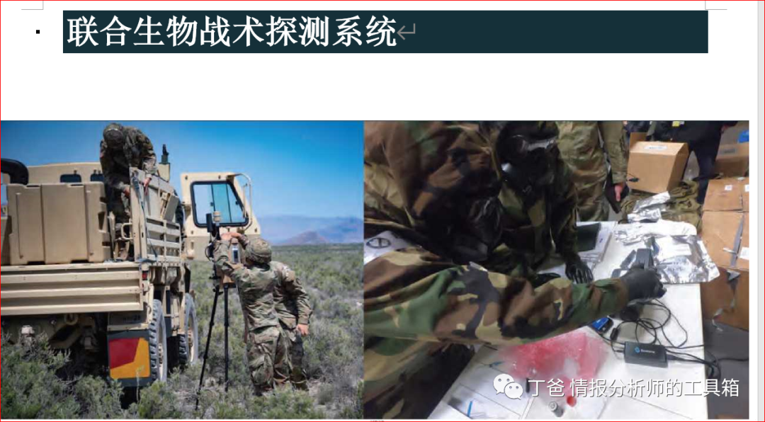 联合生物战术探测系统(JBTDS)由集成便携式生物战剂探测器和样品采集器、基站、气象站、GPS接收器、样品提取工具包和手持生物战剂识别器组成。检测器和样本收集器可以使用服务提供的、封闭的或受限的局域有线或无线网络连接到基站,以实现远程监视和报告。这也是生物战必要装备。