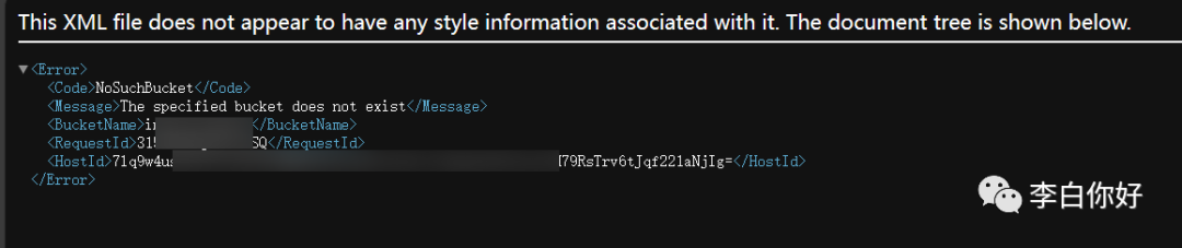 访问该地址发现为 NoSuchBucket ,表示可以接管
