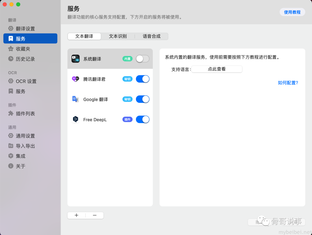 工具简介:一款 macOS 平台优秀的翻译 和 OCR 软件,自从推出了“插件”功能,让该软件更加“如虎添翼”,免费版基本够用,但骨哥为了支持咱们这位国内开发者,特意为此购买了Pro版。