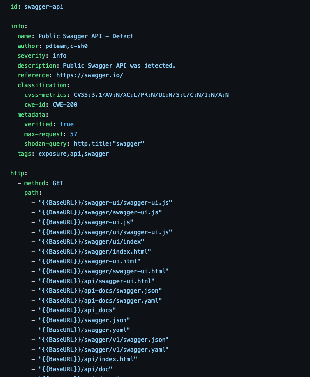 https://github.com/projectdiscovery/nuclei-templates/blob/e6c20a24de75a63b3ce01fd25925aef4604cd34c/http/exposures/apis/swagger-api.yaml#L47
