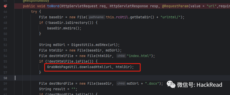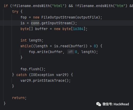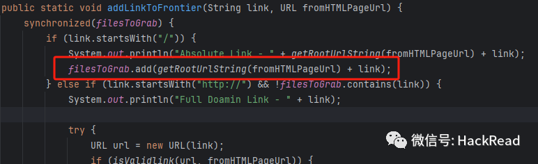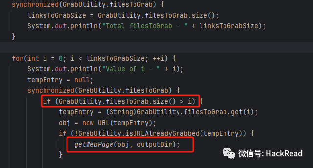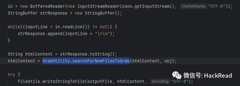 其实到上面这里还好,都是一些写文件的操作,并且写的也是index.html但是下面做的操作就是本此漏洞的关键了,软件本意应该是想做一个比较完善的爬虫,所以接下会调用GrabUtility.searchForNewFilesToGrab方法继续解析文件内容,这里的conn也就是刚才创建的链接: