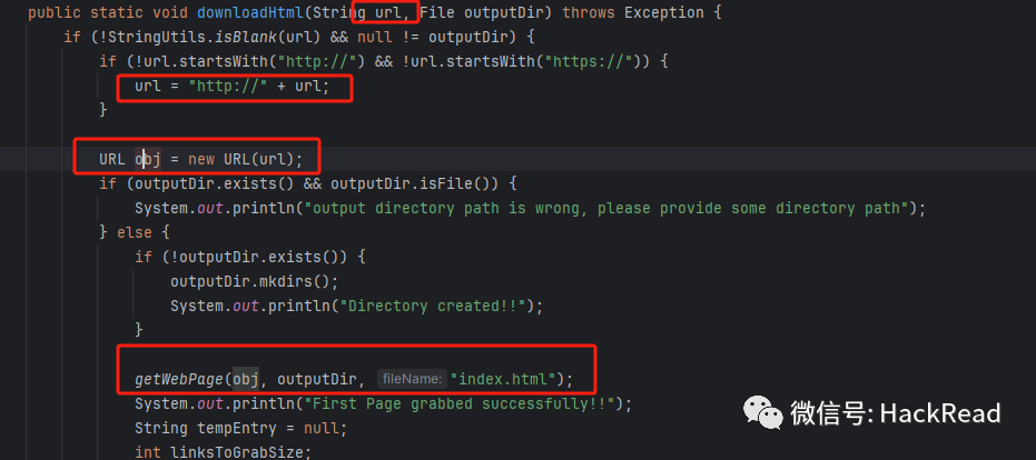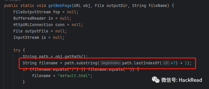 这里使用了getPage方法来处理obj,而obj又是url来的URL对象,但是疑惑的时文件名只能是index.html所以去看一下这个getWebPage方法: