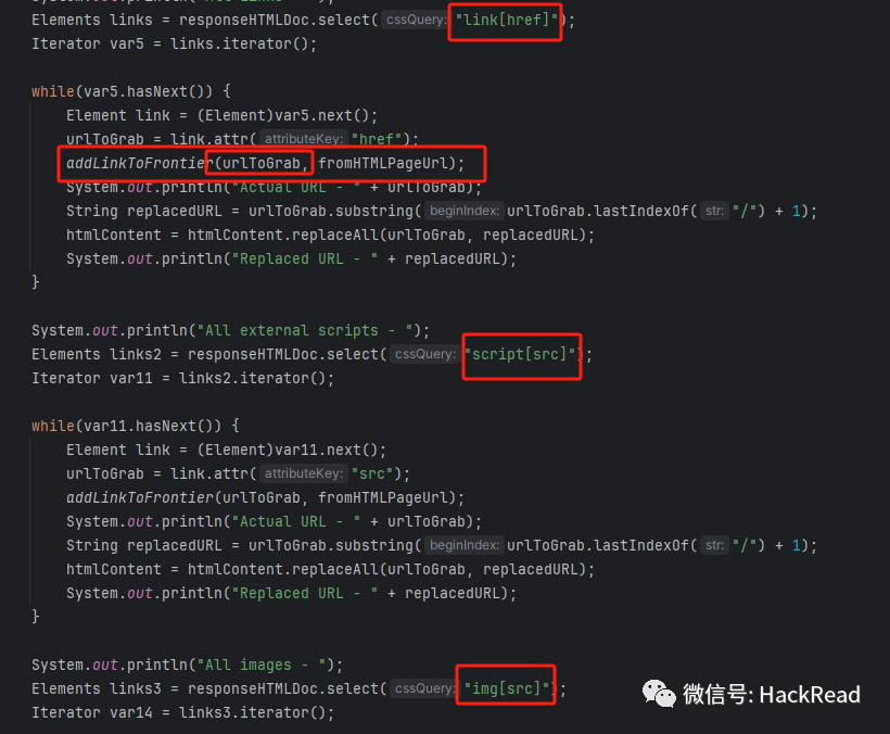 进入到GrabUtility.searchForNewFilesToGrab查看,发现其中的内容就是解析响应值,其中获取link[href]、script[src]、img[src]标签对应的内容然后存进GrabUtility的成员变量filesToGrab中: