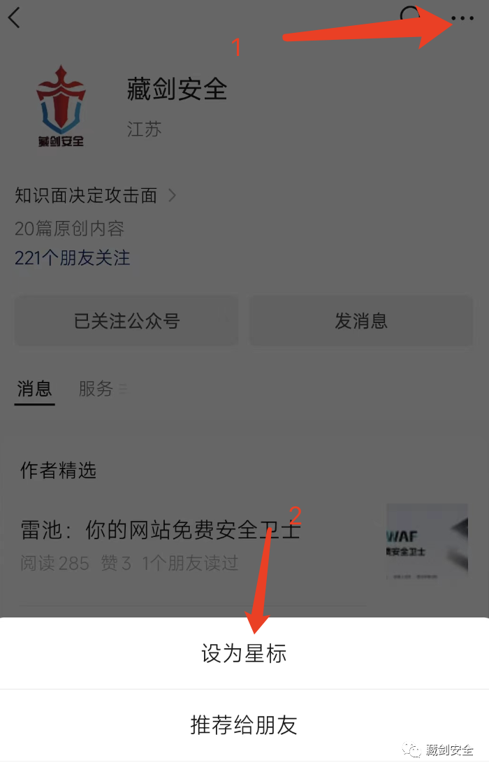 朋友们现在只对常读和星标的公众号才展示大图推送,建议大家把藏剑安全“设为星标”,否则可能就看不到了啦!