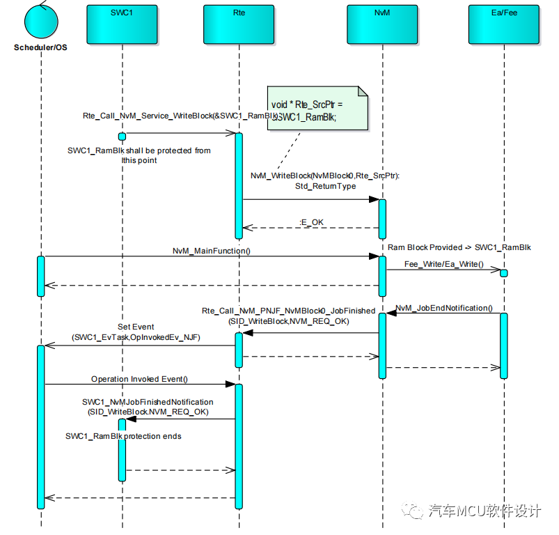 NvM的状态机每家供应商的代码区别还是挺大的,不过我们在看代码的时候首先需要了解这些API的调用时序,如下图为用户调用NvM_Write服务的时序图: