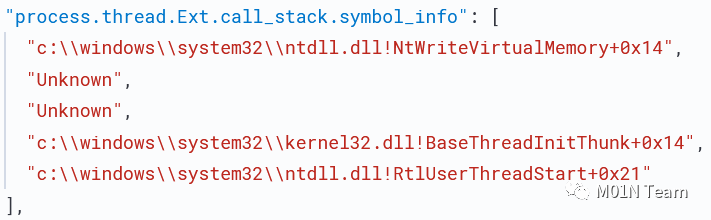 调用堆栈是一个强大的数据源,如果获取的数据可靠,则能够清晰反映行为的执行过程。基于栈回溯信息,能够还原相关API的调用序列,进而推测出其对应的行为。基于调用栈的检测方式从粒度更加精细的API调用情况对恶意行为进行识别。最新的Elastic Agent已支持基于ETW实现对相关API的监控,并获取其执行时的调用栈信息: