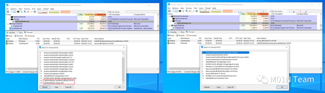 Cobalt Strike的开发团队也有相应的解决方案[5],他们介绍了一个调用栈伪造的开源项目CallStackMasker[6],能够支持硬编码的调用栈伪造以及动态获取处于指定线程状态下的其他合法线程调用栈实现伪造两种方式构造虚假的调用关系。下面左图为未经伪造的调用栈,右图为伪造后的结果: