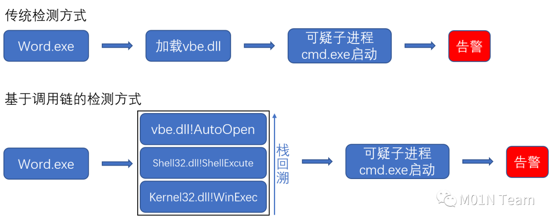 传统的检测方式中若仅有进程、DLL加载等粗粒度的信息,只能通过Office相关进程对vbe.dll的加载与文件本身来自网络,具有Web标记以及其可疑子进程等信息来推断该文件的潜在恶意行为。但这无法说明文件中确实存在风险行为,更像是在以“宁可错杀一千,不可放过一个”的查杀方案在最大程度上保障终端的安全。但结合了调用链信息的检测可以从可疑行为的调用中获取更为具体的信息,如xlAutoOpen表明宏代码会在文档打开时自动执行,shell32!ShellExecute和kernel32.dll!WinExec则对命令执行相关API做了针对性监控: