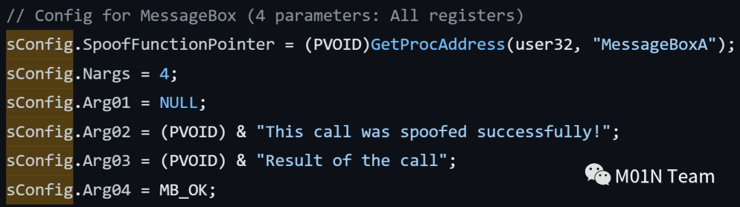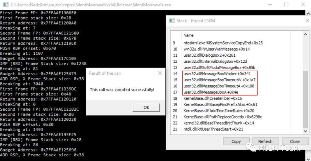 对于调用栈截断的方式,由于调用栈被异常截断,因而也是潜在的检测点之一。且篡改的调用栈由攻击者自行构造,并非真实的调用栈,故在回溯检查时可能会被标记以进行进一步的检测。在调用栈截断的基础上发展出了通过构造虚假的调用栈,且调用栈中的地址均来自真实的调用地址的堆栈欺骗方式[3]。如下图所示,虚假栈帧的构成中,函数地址为真实的MessageBoxA,且参数的构造也遵循合法函数传递:
