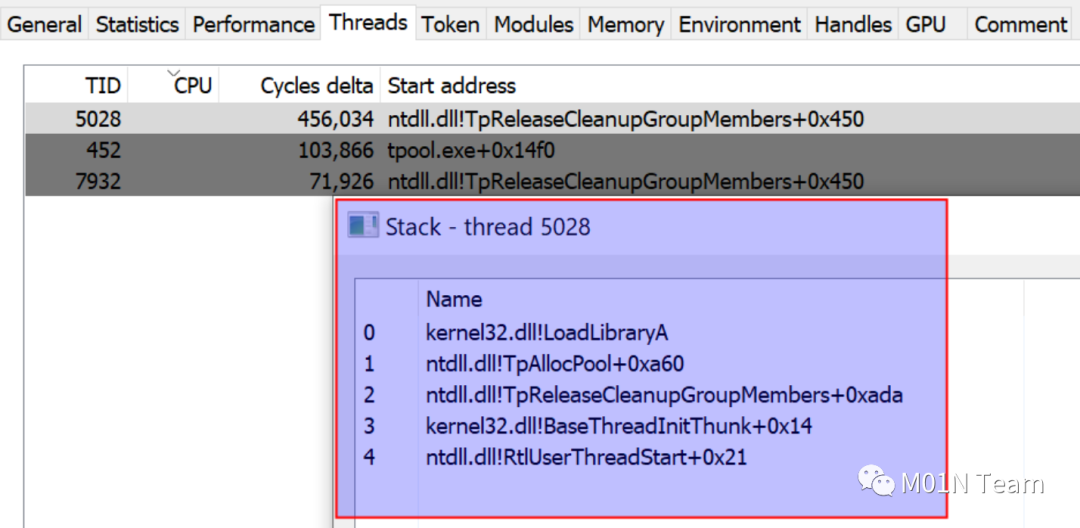 可以看到,攻击者成功将LoadLibraryA伪造成一个来自已知模块的调用,整个调用栈上不存在任何来自未知模块的地址。通过TpAllocWork的回调执行,结合jmp指令对目标函数的函数指针调用,使得栈上不出现来自调用方的返回地址,从而掩盖栈上的调用链信息。