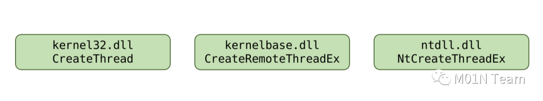 由Elastic的开源规则可以看出,基于栈回溯获取相关调用来实现威胁检测的方式中,检测规则规定了行为具体调用的API,通过具体的API调用链来甄别恶意行为。在去年Nighthawk的更新中就对一系列敏感API调用进行了等效替换,以此寻找替代API以实现绕过终端防护对敏感API的挂钩。例如常见的创建线程操作,其调用序列如下: